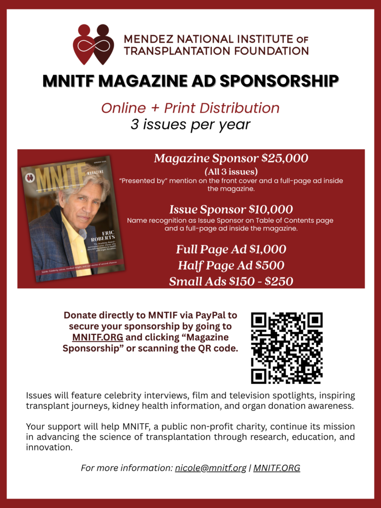 MNITF Magazine is where entertainment and advocacy come together. As the official publication of the Mendez National Institute of Transplantation Foundation, each issue features celebrity interviews, film and television spotlights, inspiring transplant journeys, kidney health education, and organ donation awareness.